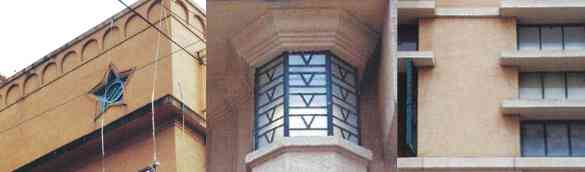 (left) Star-shaped window and Lombardy strip / (center) Art Deco lighting embedded in columns / (right) Horizontal louvers across windows